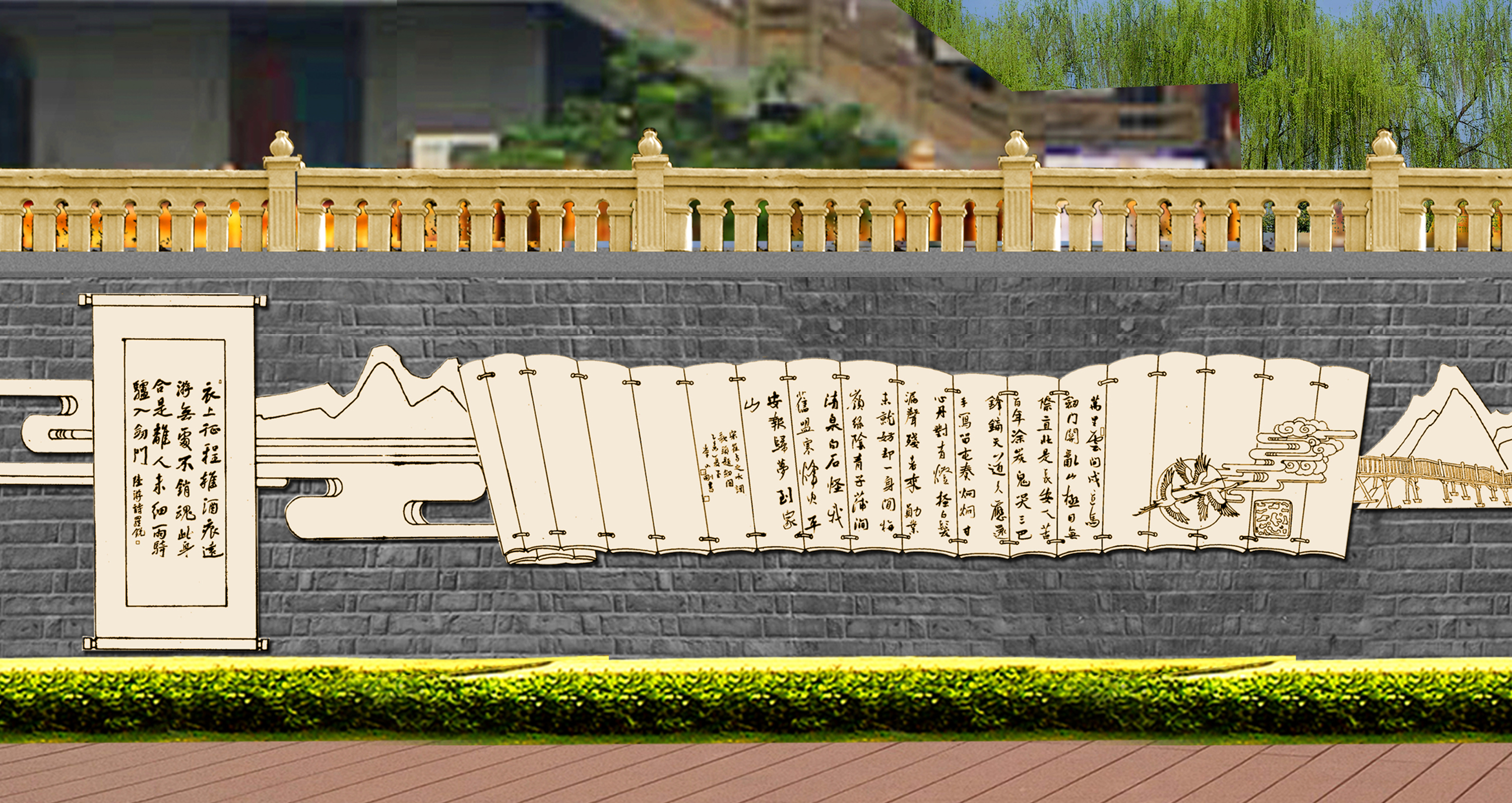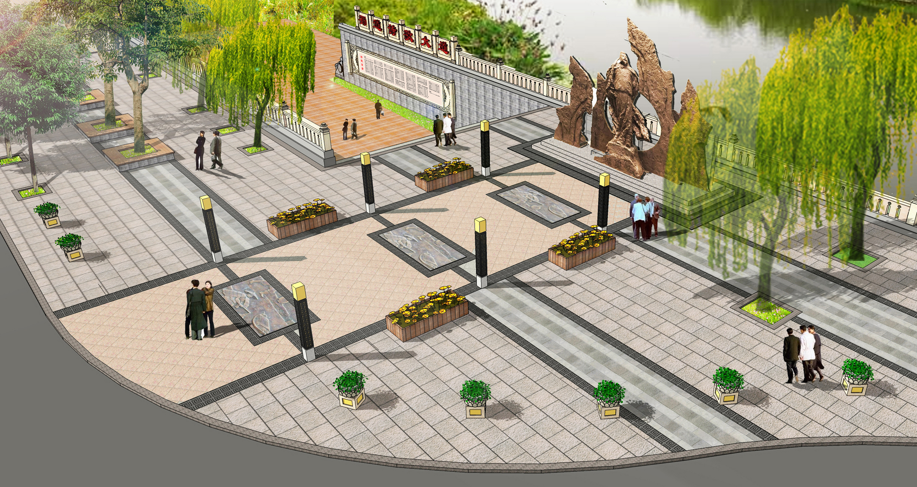 蜀道詩歌大道位于廣元市區嘉陵江畔,背靠鳳凰山景區,與皇澤寺景區隔江相望。整個蜀道詩歌大道沿著廣元市區的嘉陵江,從摩爾天城到將軍橋,途經利州西路、打鐵街、大西路、望江樓、小西路、皇澤大橋等,全長約3 公里。通過對蜀道文化的深刻解讀,以廣元“生態立市、文旅興市”的發展戰略為理念,充分結合大唐利州女皇城、國家歷史文化名城創建、嘉陵江生態文化休閑軸營造文化休閑長廊。設計上以石刻為核心表現手法,同時融合蜀道山川、壁畫、卷軸、碑林、綠植等設計元素,營造出整體統一、厚重,局部多姿多彩的蜀道詩歌大道。