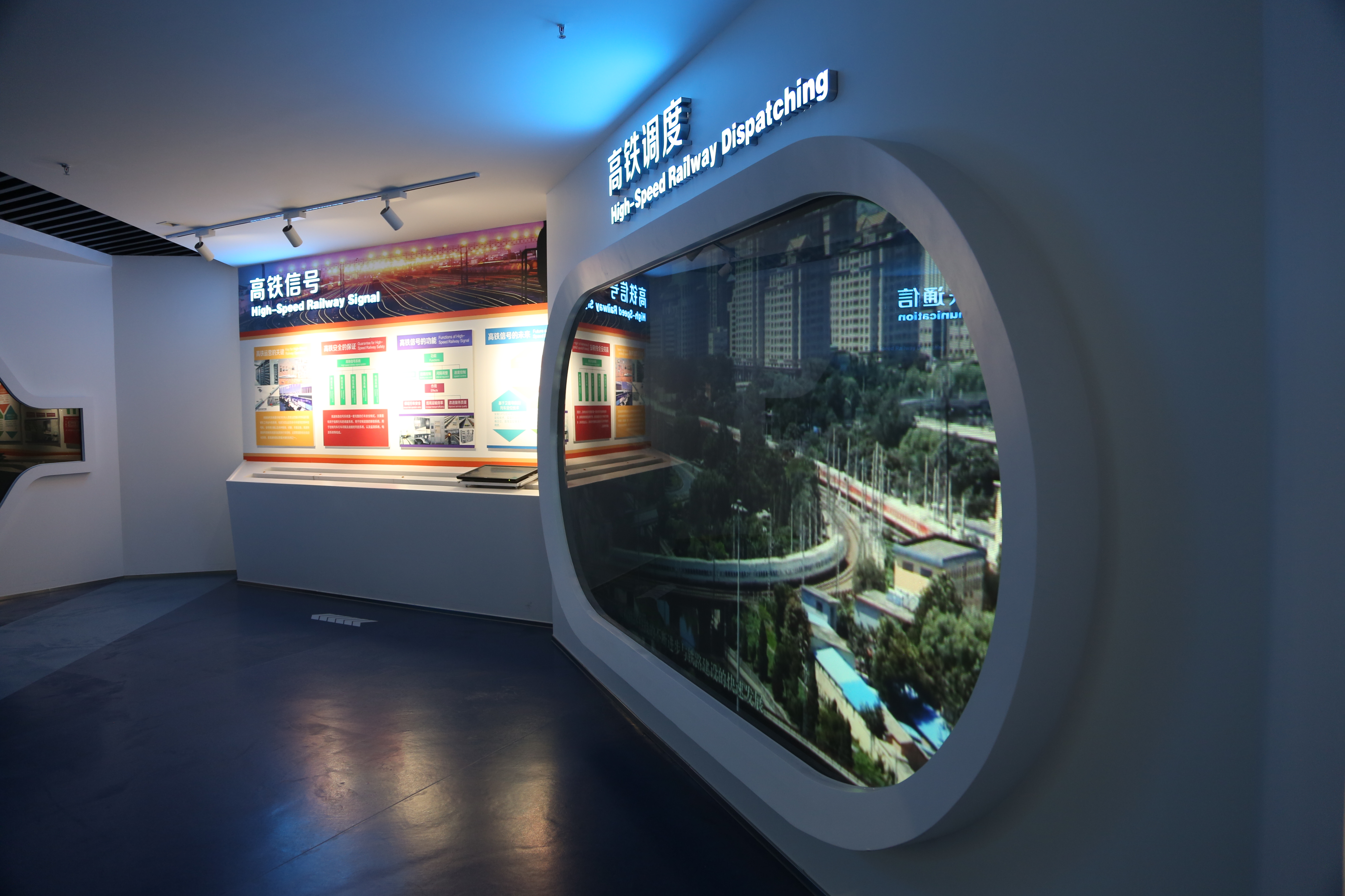 武漢高鐵展覽館,位于湖北省武漢市武漢高速鐵路職業(yè)技能訓(xùn)練段內(nèi)。為在接待非專(zhuān)業(yè)人士參觀(guān)之外滿(mǎn)足職業(yè)人士的學(xué)習(xí)需求,展覽館設(shè)在訓(xùn)練段綜合教學(xué)樓,兼顧教學(xué)功能。展館設(shè)計(jì)上最大的亮點(diǎn)就是以“高速鐵路的發(fā)展”為線(xiàn)索和重要元素,將高鐵的過(guò)去、發(fā)展、成果、未來(lái)及高鐵技術(shù)轉(zhuǎn)變成可觸摸、可互動(dòng)的趣味性展項(xiàng),營(yíng)造“科技創(chuàng)造高鐵”的主題氛圍,強(qiáng)調(diào)高速鐵路的現(xiàn)代科技高速動(dòng)感。