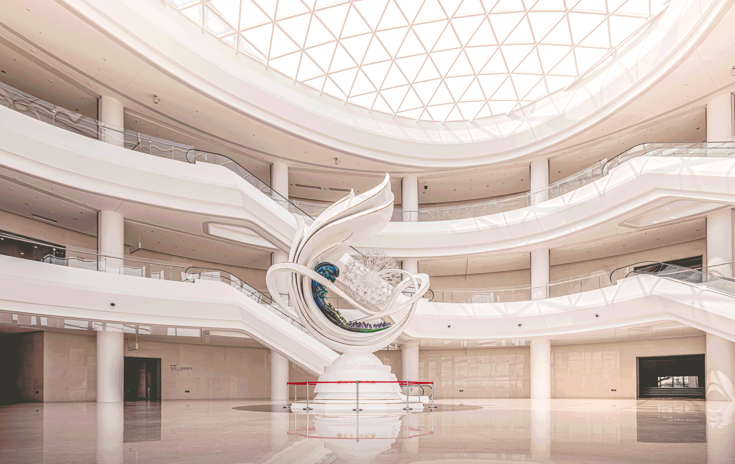 揚(yáng)子江龍鳳閣項(xiàng)目二樓大廳采用雙曲面穹頂的設(shè)計(jì)風(fēng)格,倒“U”字型頂面分布著1200個(gè)龍鱗造型。設(shè)計(jì)師運(yùn)用彩色燈帶配以鱗狀裝飾,與大堂色調(diào)完美融合,給參觀者以全新的空間體驗(yàn)。創(chuàng)新研發(fā)“超高預(yù)鑄式玻璃纖維加強(qiáng)石膏板變色龍鱗吊頂”工藝,除了實(shí)現(xiàn)更好的造型效果之外,還防火防潮、擁有良好的隔音效果,優(yōu)化了施工工藝,縮短了施工工期。
