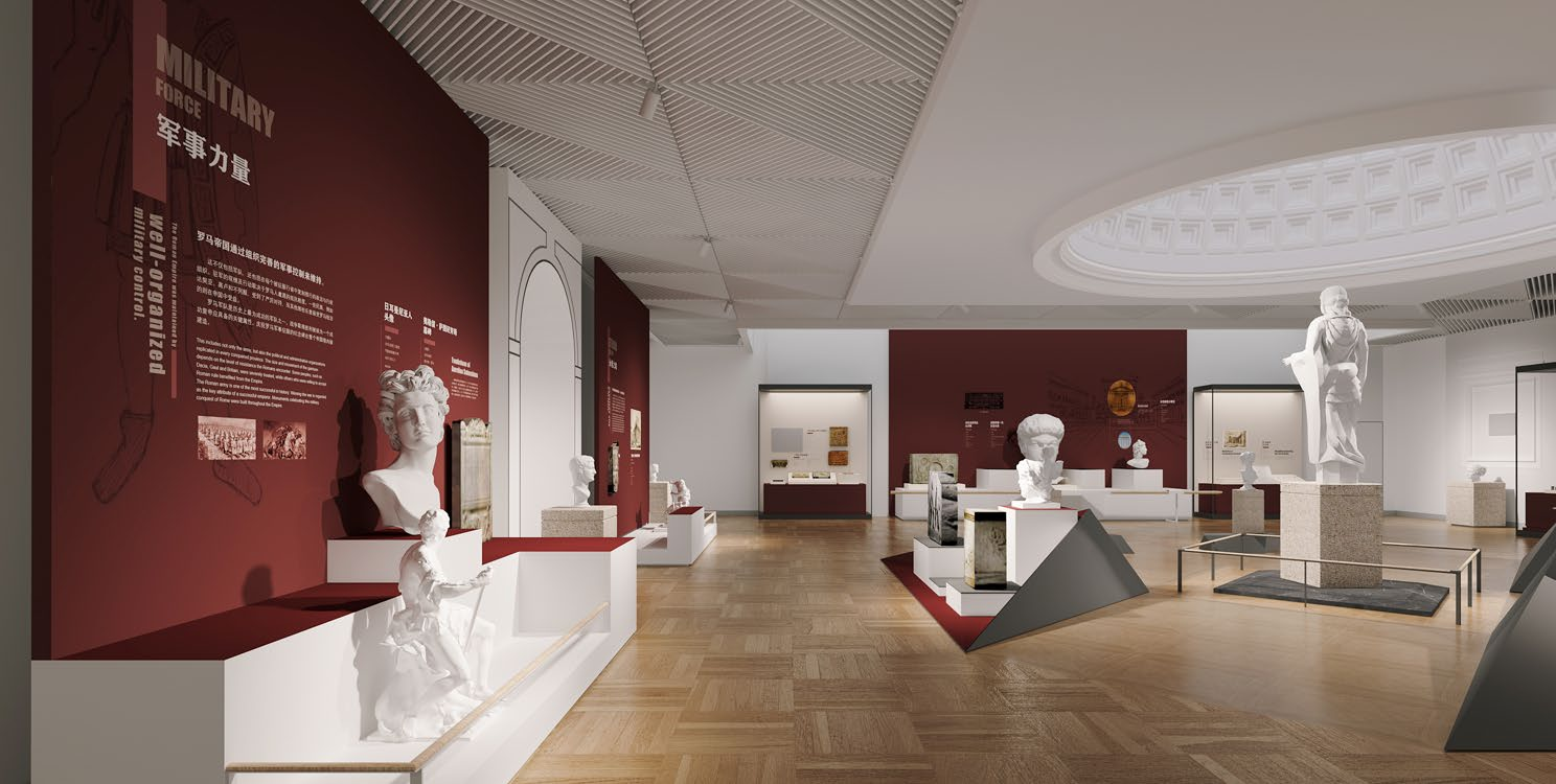 展廳運(yùn)用了紅、黃、白的色調(diào),鮮明區(qū)分展覽的敘述章節(jié);古羅馬建筑元素和AR實(shí)景互動(dòng)帶領(lǐng)人們一秒穿越古羅馬,追溯“永恒之城”羅馬的起源發(fā)展,了解疆域廣闊的羅馬帝國如何輻射歐亞非文明的過程。