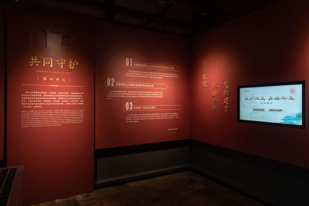 展覽以“麥積山石窟保護歷程”為主線,以“東方微笑”藝術符號為靈魂,設置“東方微笑”“跨越千年”“潛心護寶”“共同守護”四個單元,通過歷史照片、三維影像、沉浸式體驗等多種形式,融合麥積山石窟自然之景,多層次呈現石窟的營造歷史與藝術價值,立體化展示麥積山石窟保護歷程及研究成果。